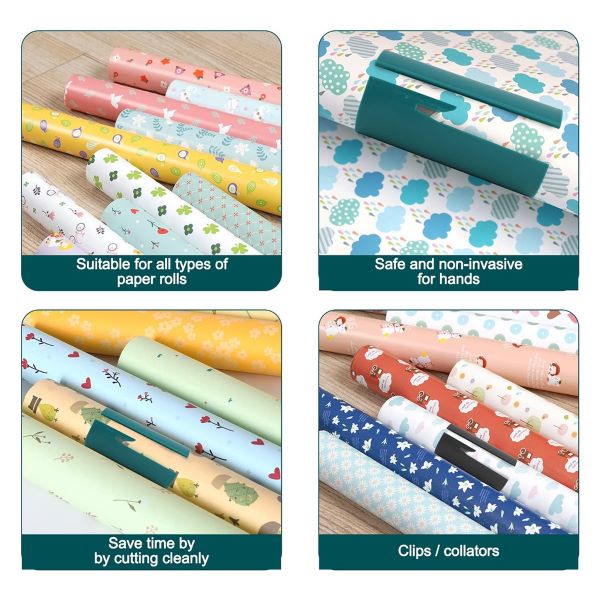 - Na het snijden breng je de inpakpapiersnijder terug naar het midden van het inpakpapier. Het werkt ook als een organizer, zodat je papier op zijn plaats blijft en netjes georganiseerd blijft, zodat het niet wegrolt of ongeorganiseerd raakt.