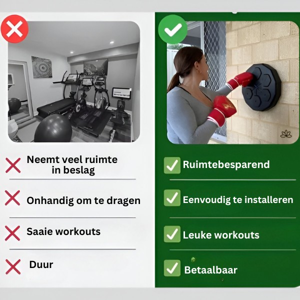 Monteer je BEATHIT op elke muur zonder te boren – gebruik de meegeleverde klittenbandbevestigingen of plakstrips. Het compacte ontwerp (40 x 40 x 6,5 cm) past perfect in elke thuisgym, woonkamer of garage.