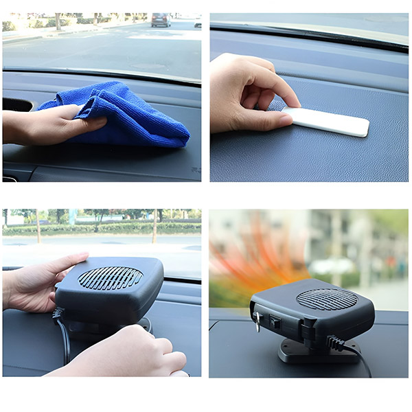 Geen gereedschap nodig! Bevestig hem eenvoudig op je dashboard met een klevende basis, steek hem in de sigarettenaansteker van de auto en je bent klaar voor je winterrit.