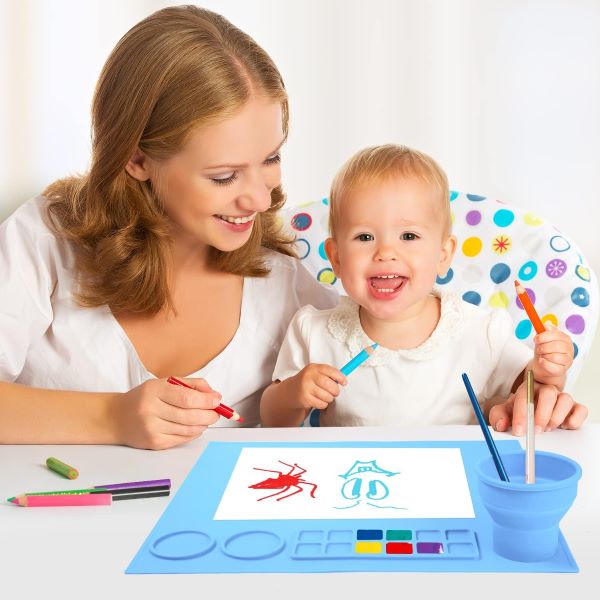 Onze allereerste mat met een ingebouwde opvouwbare borstelreinigingsbeker. De borstelreinigerbeker is ontworpen om water vast te houden en penselen schoon te maken.