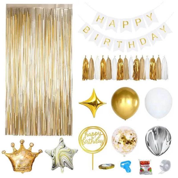 60 ballonnen in verschillende kleuren; 1x kroonvormige ballon; 2x vijfpuntige stervormige ballonnen; 2x vierpuntige stervormige ballonnen; 1x gordijn van glinsterende linten; 1x Happy Birthday banner; 5x set kleurrijke decoratieve kwastjes; 1x Happy Birthday taartdecoratie; Decoratief lint, ballonknoopaccessoires, lijm en ballonbevestigingstape.