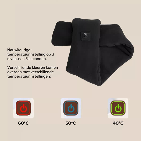 Sluit de sjaal aan op de draagbare oplader en druk op de knop – het verwarmen begint onmiddellijk. Pas de temperatuur eenvoudig aan jouw wensen aan met de 3-trapsregelaar.