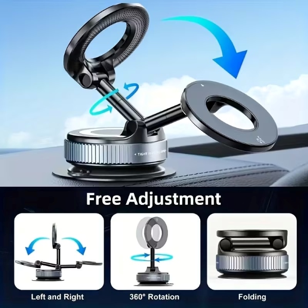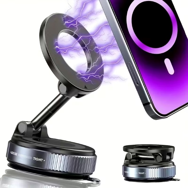 De MAGHOLDZ-telefoonhouder maakt gebruik van een krachtige vacuümgrip die sterker wordt bij trillingen, zodat je telefoon stevig blijft zitten op gladde oppervlakken zonder sporen achter te laten op glas, dashboards of bureaus.