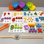 Kleurrijke kralen, structuren en hulpmiddelen prikkelen zicht en tastzin om het vroege wiskundig inzicht te verdiepen.
